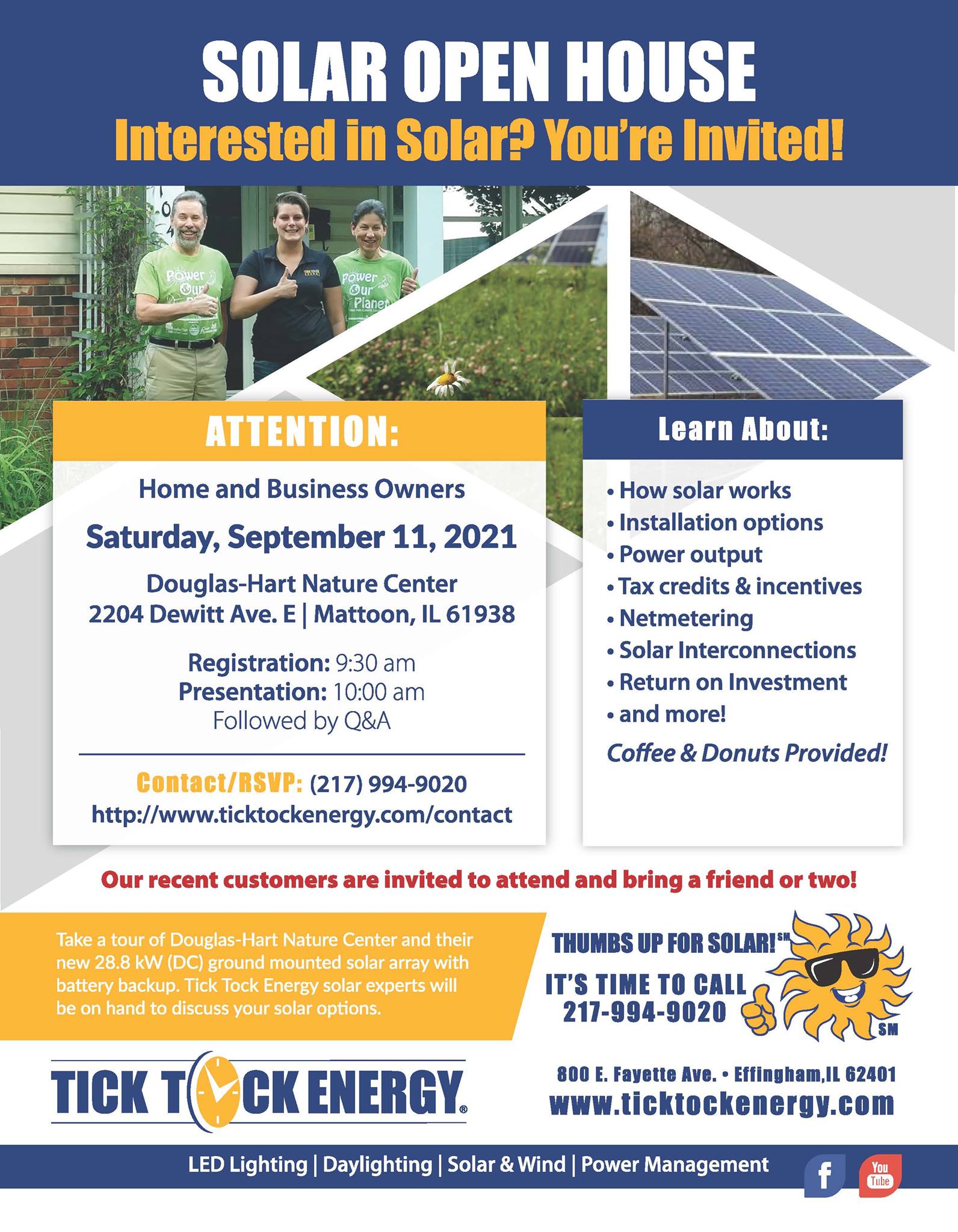 Tick Tock Energy, founded in 2006 and located in Effingham, IL, is one of the Midwest’s premier providers of solutions to cut your utility costs. In addition to being a leading LED lighting and solar contractor in Illinois, we also offer knowledgeable energy solutions consulting to our customers in St. Louis, MO and beyond. Are you striving to cut your energy bills and achieve greater energy independence? If you’re a commercial business, farm or residential property owner, or other like-minded person or organization, you have come to the right place! Welcome to our website. Here you’ll find a summary of our energy-efficient LED lighting, solar, small-wind, daylighting, and power management solutions we offer. We hope to inspire, educate and motivate you to take action. Our energy solutions company grew out of two mantras: “time is ticking – it’s time to take action” and “time is money – don’t delay, take action now!” Find out how we can help lower your energy costs and/or boost your cashflow today – don’t delay! Please sign up for our newsletter and keep in touch. Call or email Tick Tock Energy through our Contact Us page.