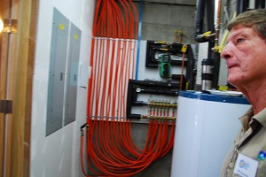 Pictured: Bob Grossman shows the "brains" of his 5,700 square-foot straw bale home in Golden, Colo. to visitors on the solar tour. He used these plastic tubes to plum the entire home. He did it himself in two days, he said. The red ones will efficiently carry hot water heated by hydrothermal solar panels on the home's roof.